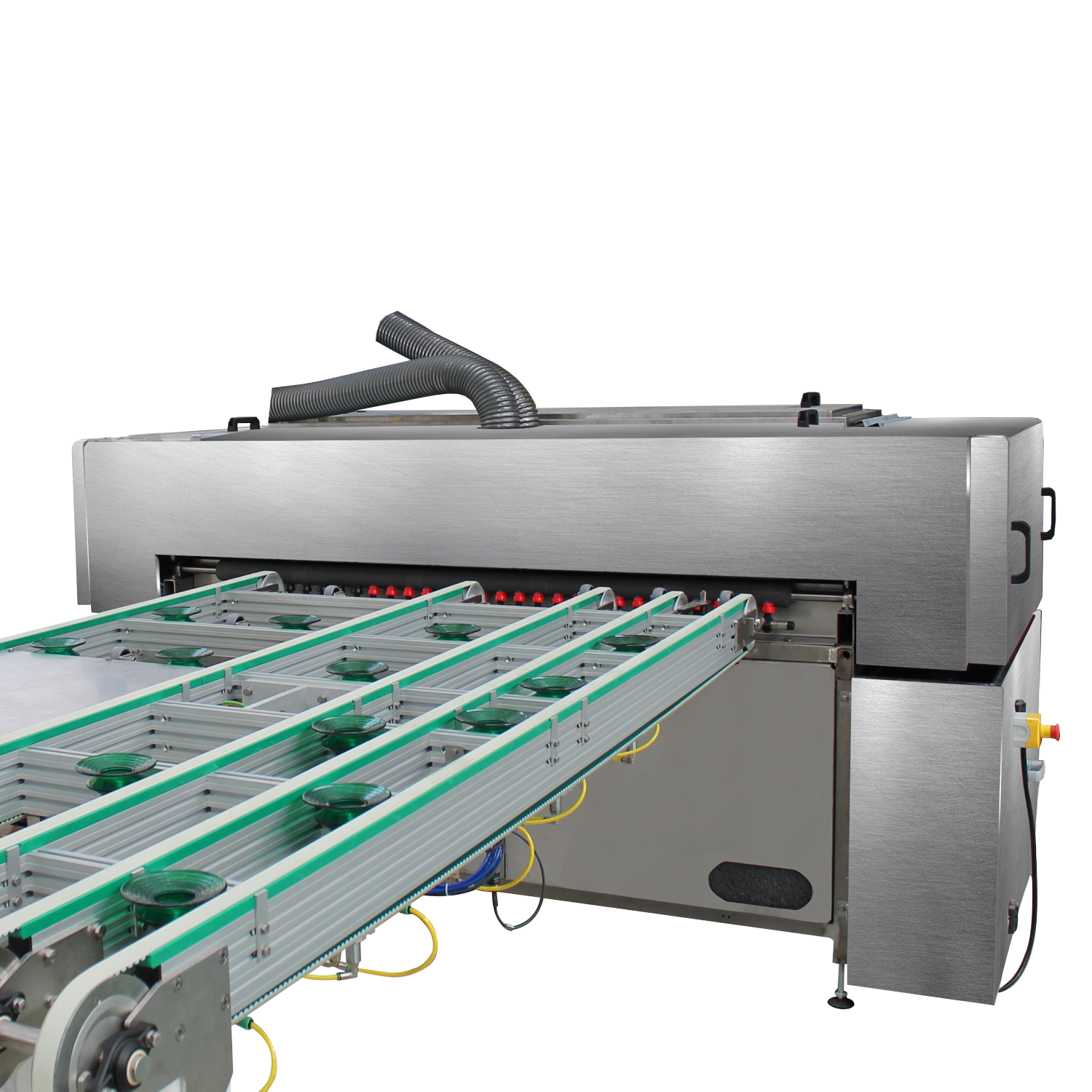 The machine’s fully enclosed structure with microswitch-controlled doors ensures maximum operator safety. Powered by Siemens CPU and Simotion software, the system delivers precise motion control and seamless PLC integration. The high-efficiency washing and drying section uses fine-grain brushes, recirculated warm water, and high-pressure air blades to achieve spotless, crystal-clear results, even on Low-E glass, with minimal maintenance.