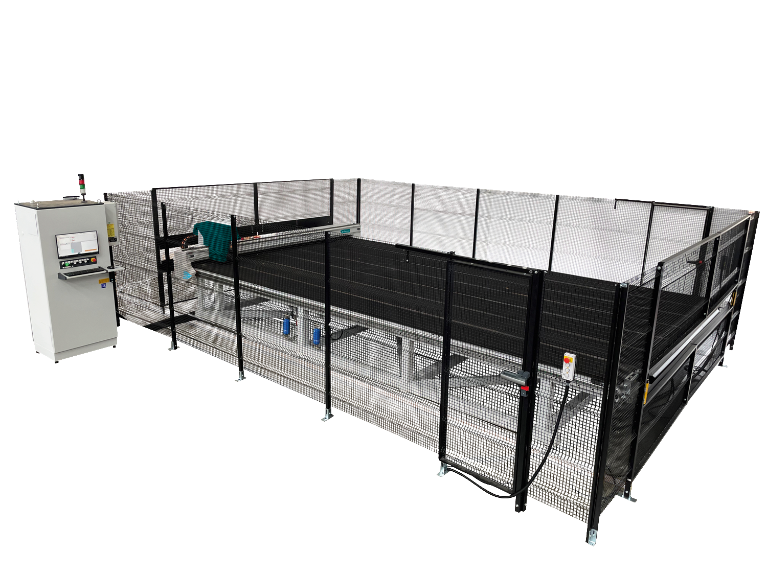 Designed with full perimeter protection, photocell-guarded loading areas, and secured maintenance access, the system prioritizes operator safety. Its intuitive interface reduces training time and simplifies operation, while the automatic tool-change capability supports mirror cutting and specialized applications, expanding production flexibility.