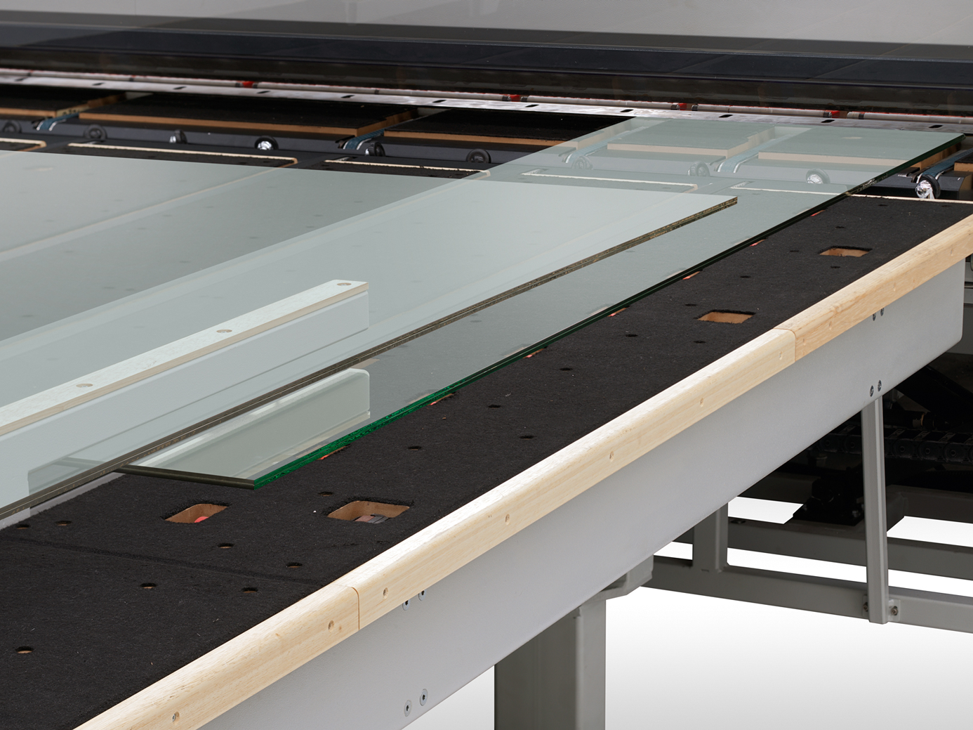 An integrated transport belt system automatically positions glass sheets for cutting and manages remnants during subsequent operations, enabling a smooth and efficient workflow. Interpolated suction cups allow automatic strip rotation for orthogonal cuts, while advanced cutting head control supports complex shapes such as parallelograms and trapezoids. The system also enables narrow trim cuts—down to 20 mm—optimizing sheet layout, increasing yield, and minimizing material waste while reducing reliance on manual operations.
