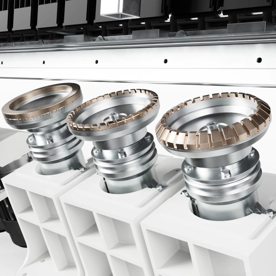 Designed for simplicity and efficiency, the machine features a 5.7” touchscreen control panel with intuitive navigation and clear visuals. Functions such as Grind&Stop and spindle selection optimize energy use and machine operation. The integrated HiWash system enhances post-processing by removing residues, improving glass handling, and supporting continuous workflow without the need for additional equipment.
