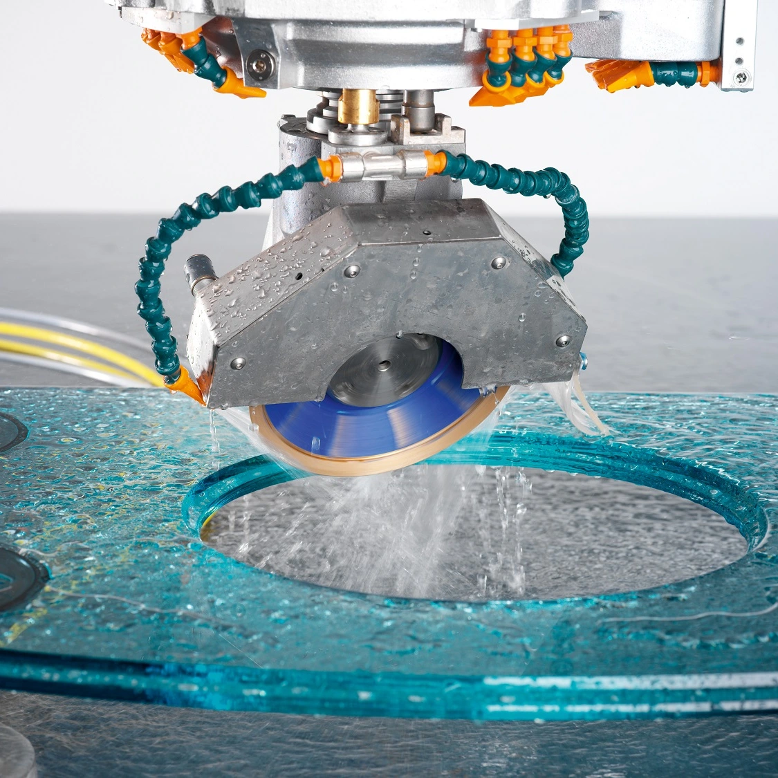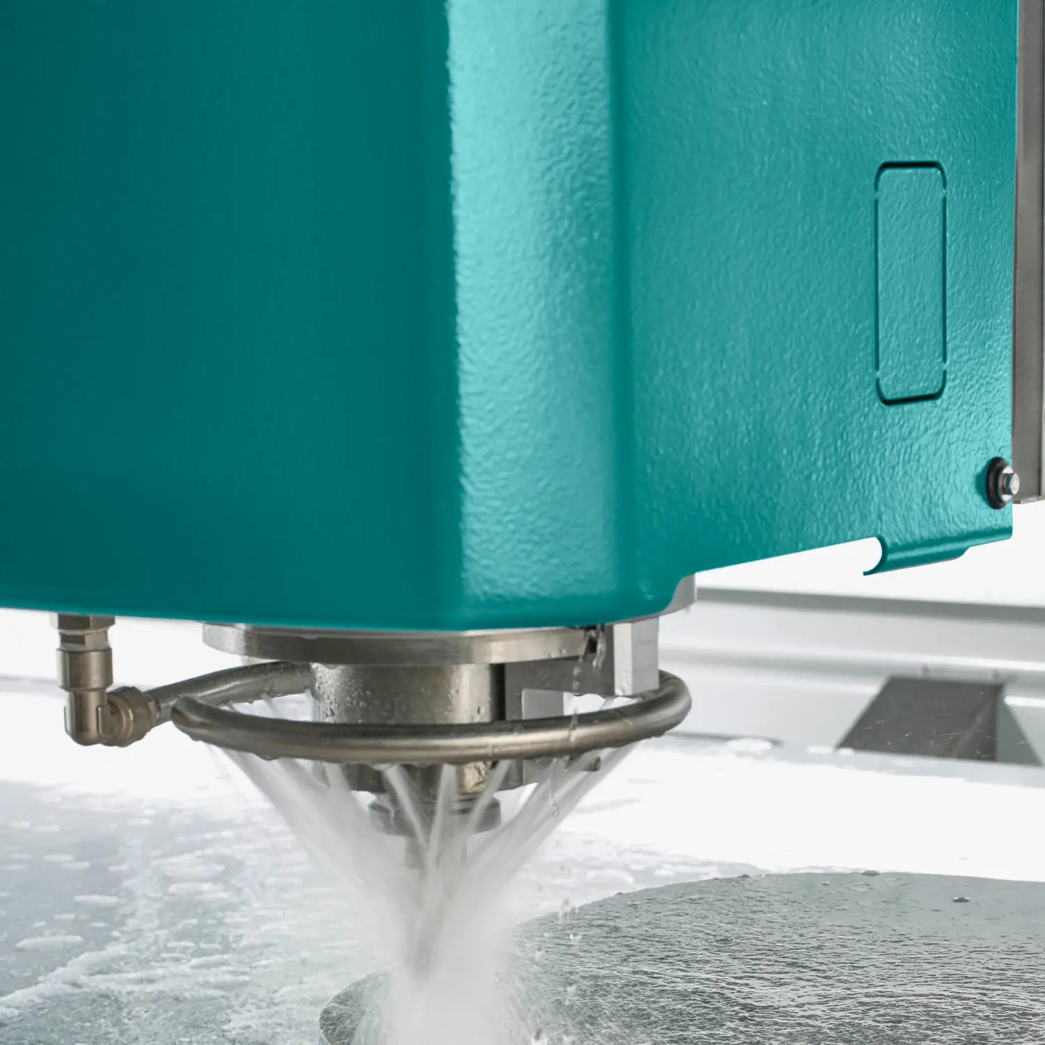 Rock-solid mechanical transmission, including linear guides, rolling screws, and racks, ensures vibration-free movements for exceptional precision and reliability. A high-pressure water booster delivers up to 60% faster processing, with a directional water jet precisely targeting the grinding wheel for efficient, high-speed edge finishing.