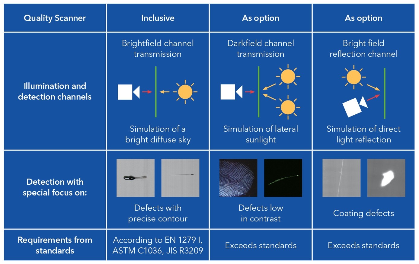 The Quality Scanner 3D has its name from the fact that it can combine up to 3 Detection channels in one inspection device. But what does that mean? If looking through a glass against a bright or dark background, or even looking at the glass surface in reflection, you can see different defects showing up: high contrasted defects like inclusions, bubbles or scratches against a bright background, smooth and low contrasted defects like hairline scratches, cork marks or other smooth residues against a dark background with an illumination from the side or LowE coating scratches or pinholes in reflection. So for all different defects the Quality Scanner 3D offers the right illumination and viewing angle to find them.
